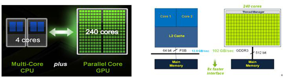 드디어 기다리고 기다리던 이 메인보드의 포인트 부분이다. 만약에 당신이 사용하고 있는 컴퓨터보다 20~30%의 성능 우위를 보인다하면 비용적 측면을 생각해서 컴퓨터를 교체할지 말지에 대한 고민을 할 것이다. 하지만 2~3배가 빨라 진다면 심각하게 고민을 하고 궁극적으로는 컴퓨터를 교체할 것이다. 그런데 100~200배까지 빨라진다면? 답은 바로 이 CUDA 병렬 컴퓨팅 기술에 있다. 막대한 병렬 컴퓨팅 능력을 자랑하는 오늘 날의 GPU는 Hight Performance Computing(HPC)에 있어 가장 적합한 솔루션이다. CPU는 operating system, task 처리와 같은 순차적인 업무를 위주로, GPU는 massive한 data를 처리하게 된다. GPU는 CPU대비 10배 가까운 메모리 인터페이스 속도와 240개의 core에서 동시에 데이터를 처리 함으로서 최대 200배 이상으로 계산 속도를 높일 수 있다.