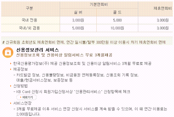 그런데 요거 KB Star(3차원 입체가 좀 나은듯)에는 크레딧뱅크 할인 기능이 들어있습니다. 연간 1만원짜리(만기연장시 8천원) 크레딧뱅크 서비스를 4500원에 쓸수 있게 해주네요. 요 카드 자체의 제휴연회비가 3천원, 첫 3개월 무료, 이후 연장 연간 2천원(9개월은 1500원 꼴) - 첫해 4500원, 그다음 해부터 5000원 꼴.