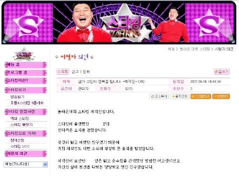 ▲ SBS '놀라운 대회 스타킹' 홈페이지에 올라온 숨진 이모양에 대한 제작진의 추모 글.