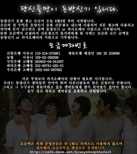 4. 위와 마찬가지로 하지만 조금 틀린 동방신기를 응원하는 신문광고는 다음카페 당신들만이 동방신기 입니다 에서 시작되었습니다. 역시 많은분들이 조금씩이라도 도와주시면 많은 돈이 모일거에요.