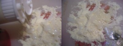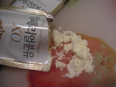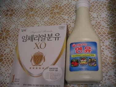 (연유 뿌리는 걸 찍으려다가 연유가 너무 많이 들어가 남은 분유를 더 넣었어요.)
