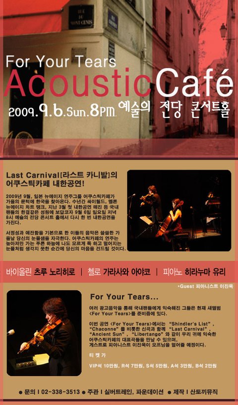 2009년 9월, 일본 뉴에이지 연주그룹 어쿠스틱카페가 가을의 문턱에 한국을 찾아온다. 수년간 싸이월드, 멜론 뉴에이지 차트 랭크, 지난 3월 첫 내한공연 매진 등 국내팬들의 한결같은 성원에 보답코자 9월 6일 일요일 저녁 8시 예술의 전당 콘서트 홀에서 다시 한 번 내한공연을
