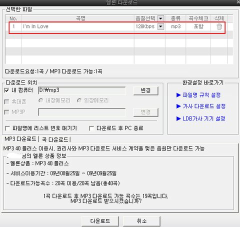 2. 곡명과 종류(mp3파일형태), 다운로드 위치 등을 확인한 후 다운로드 버튼 클릭합니다.
