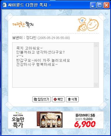 소속사에서 내렸다더군요.. 아마 지금보내봐야 읽지도 않을것 같습니다. 제 쪽지도 아직 수신이 되지 않은 걸로 나오는군요..