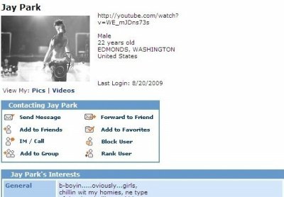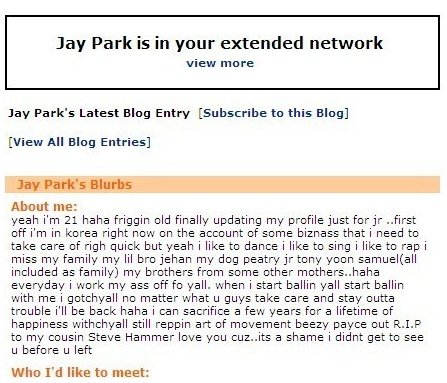 [Feb 22, 2005 12:20 AM] wassup foo....haven talked to ur gay face in a while...watchu bin doin...watchu do now a days...still havin pissy fits boutchur rappin?.....korea is gay....i hate koreans.....i wanna come back....like no other...friggin a....n e ways yea...hit me back jus to chat...ur biggest fan...this is jay the MAN...PEACE