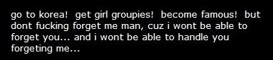 [Mar 4, 2005 12:24 PM] waddup son...u get less comments den me...its funny how we‘re both losers...sheesh...we needa get more popular....n e ways...yea man korea is whack..but eveyone thinks i’m like illest rapper wen i suck nuts at rappin...so dass pretty dope...haha peace