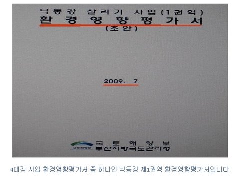 하천법에 의하면 10km 이상의 하천 공사는 반드시 환경영향평가를 하게 돼있습니다. 그래서 4대강사업이 불법이라는 시비를 피하기 위해 100억 원의 혈세를 퍼주며 단 30일 만에 요식적인 절차로 만든 엉터리 환경영향평가입니다. 결국 4대강 사업이 4대강 살리기가 아니라 살아있는 4대강 죽이기가 될 것임을 보여주는 것이 아닐까요?