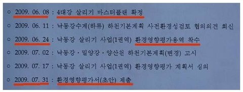 단군 이래 최대 사업인 22조원의 엄청난 혈세가 투입되는 사업인데, 환경영향평가서 작성 기간이 겨우 30일이었습니다. 아래 자료를 보면 4대강사업의 대단한 속도전이 잘 나타나 있습니다.