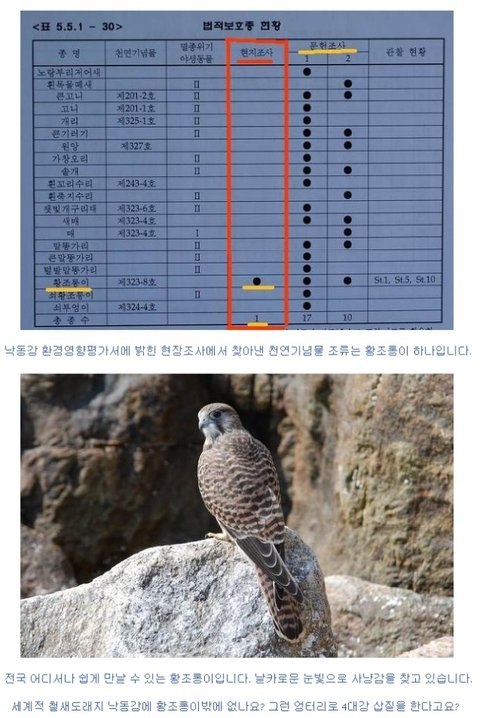 낙동강 현장에서 조사원들이 눈으로 직접 목격한 천연기념물이나 법적 보호종은 황조롱이 딱 하나라고 밝히고 있습니다. 국토해양부가 만든 4대강홍보 동영상에 4대강에 철새가 없다고 하더니, 정말 낙동강엔 천연기념물이나 법적 보호종인 희귀 철새가 전혀 없는 것일까요?