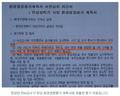 한강 살리기 환경영향평가는 낙동강보다 더 볼게 없습니다. 얼마나 요식행위로 만들었으면 한강 환경영향평가 계획서 심의에 참여한 한양대학교 한00교수가 “수질 조사와 자연환경의 동식물상의 조사항목, 시기 및 조사 횟수가 명시되어있지 않음”이라고 평가했겠습니까? 심지어 이교수는 “사업의 진도가 아무리 바쁘더라도 적어도 강우 전과 후를 포함한.... 현지 조사 계획이 필요함”이라고 평가서에까지 이렇게 지적하고 있습니다.
