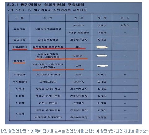 특히 한강 환경영향평가 계획서 심의에 참여한 명단을 보면 그 부실함이 얼마나 심각한지 단적으로 보여줍니다. 강바닥을 모조리 준설하고, 물길을 막는 보를 세우는 등의 얼마나 복잡하고 그 영향이 막대한 공사인데, 관련 교수라고는 토목학과 자연과학과, 환경식품공학 전임강사 달랑 셋뿐입니다. 나머지는 업체관계자와 공무원들뿐입니다. 이게 22조원짜리 국책사업 환경평가라고는 도저히 믿기지 않습니다. 엉터리가 되는 것은 너무도 당연한 결과입니다.