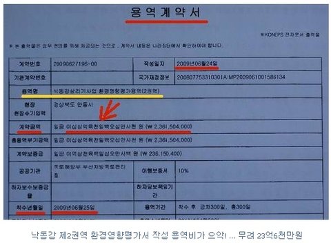 그렇다면 3~4일 만에 현장 조사를 끝내고, 그저 이 책 저 책에서 자료를 끌어 모아, 그것도 철 지난 수년전 자료를 비비고 주물러 사무실에서 후다닥 만든 4대강 사업 엉터리 환경영향평가서 제작비용은 얼마일까요? 어휴~ 놀랍게도 무려 23억6천만 원입니다. 대단하죠?