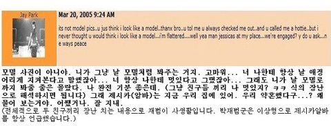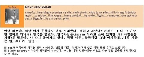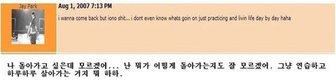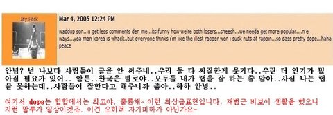 글을 다 읽어본 다면 재범이가 한국을 비하 한 것이 아니라, 그저 친구들에게 고민을 묻고 하소연 하고 투덜거린 것 임을 알 수 있다. 캡쳐본은 그냥 복사해 온 것이다. ──────────────────────────────2005.02.22