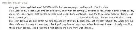 dang yo...haven updated in a LONNNGGG while..but yea anyways...waddup yall...i've bin doin aigh...practicin...lessons...all i've bin doin lately know wat i'm saying......breakin is koo..i wish i could break wit my crew..tho....enterin my first battlin in korea next week...bboy challenge....gon try to go show them wat bboyins all bout....ummm yea i got offered a contract...but its fo 10 years....(지워진 부분) iono what do too....i'm so torn with that...i feel like i don fit in..i don like gettin my hair touched by other ppl besides me...got my hair "styled'' the other day cuz they made me...i thought it was gay..thank god they lemme keeps my clothes know wat i mean....i really aint like these other doodes...and i feel like i just don belong here know wat i mean....