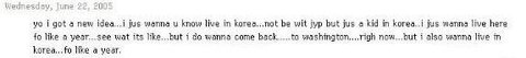 yo i got a new idea...i jus wanna u know live in korea...not be wit jyp but jus a kid in korea..i jus wanna live here fo like a year...see wat its like...but i do wanna come back.....to washington....righ now...but i also wanna live in korea...fo like a year...i could go wit jyp do it fo 10 years...i mean ay...i wouldn mind money..and fame..and fans..and that ish but its not wat i strive for...not wat i wanna accomplish in life...got bigger ish to fry know wat i mean...but if i come back..would my life jus be harder....u know....i mean it would be cool...if i got my family and friends to back me up wen times get hard...but would they be there for me...know wat i'm sayin....i'd hafta get a g.e.d get a job..go to cc...transfer to a university...iono seems pretty hard...would i regret leavin korea? and if i stay here...would i regret stayin here? life is jus to gay to describe in words...only way i can describe it is...life is jehan...life is so jehan..gosh only one person i would miss if i left here