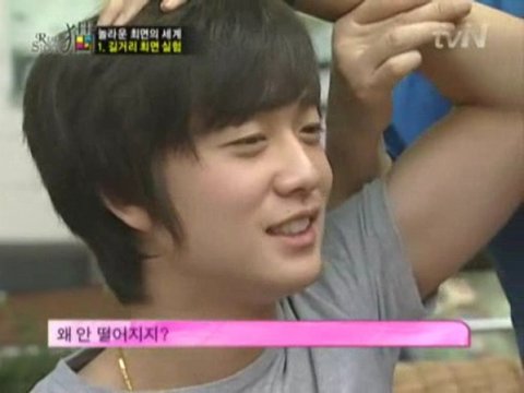 "자 지금부터 눈을감고 손에 초강력 접착제가 붙어있다 생각하고 머리에 붙이세요