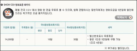 쉽게 설명하면 요금제 사용하면 난 공짜, 동반인은 5,000원, 총 5,000원으로 최신영화를 CGV에서 관람할 수 있다는 거지요. 기본요금도 비싸지 않으니 강추요.
