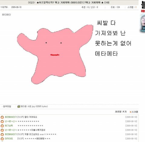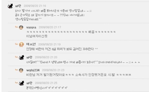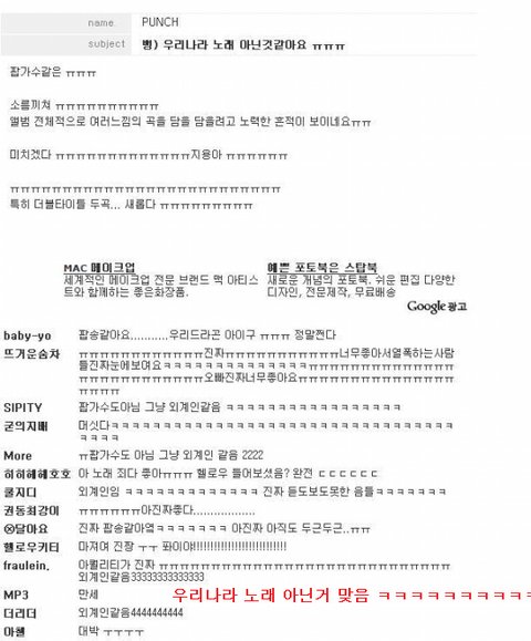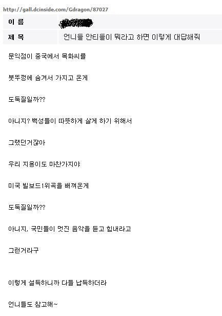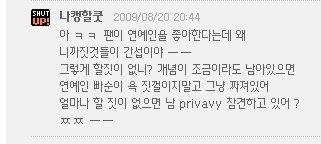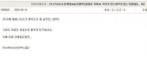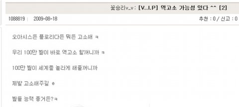 모든 VIP분들이 저렇다고 생각은 안하지만.. 저건 정말 팬도 욕먹이고 가수도 욕먹이는 아주 몰상식한 언행이라고 생각이됨 (꽝꽝) 특히, 김대중대통령 서거일에 대해서 저따구로 손가락을 휘놀리는 건..ㅉㅉ