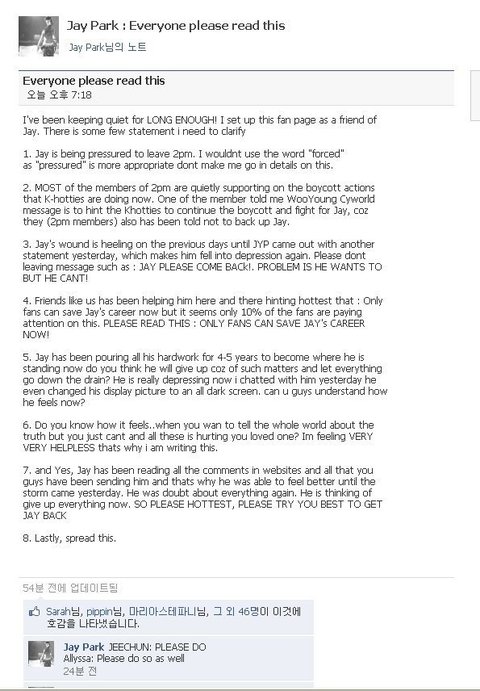 대부분의 2pm 멤버들은 한국핫티들이 현재 하고있는 보이콧을 지지하고 있습니다. 한 멤버가 저에게 말한 바로는, 새로 바뀐 우영이의 싸이월드 메세지가 한국 핫티들에게 보내는 숨겨진 메세지로써, 보이콧을 계속하여 재범이를 위해 싸워주기를 바라고 있습니다. 왜냐하면 2pm 멤버들도 기획사에게 재범이를 지지하지 않도록 (편들지 않도록) 기획사에게 이야기를 들었기 때문입니다.