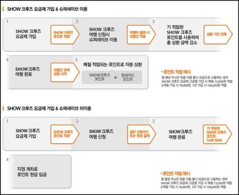 쇼크루즈라고 해서 쇼에서 내놓은 여행사는 아니고, 요금제 인데, show 와 현대카드 와 크루즈 선상 3군데서 뭉쳐 만든 이색적이고 특별한 요금제 이다.