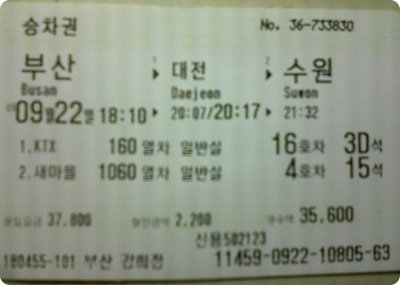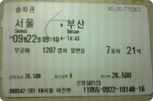 서울역으로 가던 전철안에서 만취와 피곤으로 인해 벌겋게 충열된 저의 두 눈을 보며 '아 집에서 샤워도 좀 하고 술도 좀 깨고 나오던가 아님 그냥 나오지말걸... ' (갑자기 후회가 쓰나미처럼 몰려오기 시작합니다. 하지만 집으로 다시 돌아가긴 너무 멀리온 저는 '기차안에서 좀 자고 부산가자마자 좀 씻고 돌아다녀야지...'라고 생각했습니다.) 먼저 도착한 저는 그래도 내가 한살 오빠고 남자니까... 부산으로 향하는 9시10분 기찻표를 두장 끊어 놨습니다. (기다리는 동안 혼자 괜히 들떠서 태종대에 가면 유람선을 타고 해식애를 관광할수 있다고 tv에서 본 기억이 있어 유람선 타는것도 괜찮겠다며 혼자 051]114에 대뜸 전화해 태종대 유람선 관련문의 어디서 하는지 물어보고 나름 여행 계획을 머릿속으로 그려가고 있었던 찰나...)