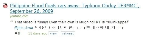 YuBinRapper / jen_shwa가 필리핀에 상당히 악감정이 있는듯, 최근 발생한 필리핀 홍수 관련 영상을 링크로 걸며 웃기다고 말하고 있네요. 물론 단순한 악감정보단 혐한류를 퍼트리려는 목적 같지만요^^