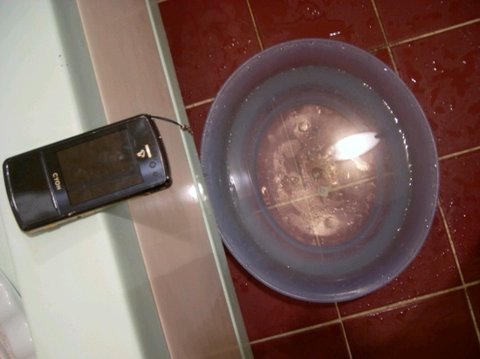 자네의 핸드폰은 물에 빠져 죽게 될껄세..