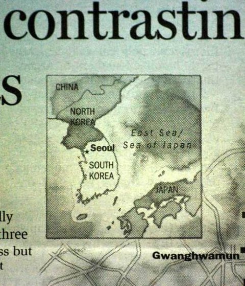 가수 김장훈의 노력이 드디어 결실을 맺고 있다. 미국 유명 경제신문 월스트리트 저널(WSJ)은 한국식 명칭인 동해를 일본해보다 앞서 표기한 지도를 실고 보도하였다. 월스트리트 저널(WSJ)이 지난 19일 B섹션 5면에 실은 '서울 관광 홍보' 광고 섹션 기사에 첨부된 사진에 따르면, 동해를 'East Sea/Sea of Japan'로 표기했다. 그동안 월스트리트 저널(WSJ)는 동해를 'Sea of Japan'으로 단독 표기하던지 'Sea of Japan/East Sea'라고 표기하였다. 가수 김장훈은 한국홍보 전문가인 성신여대 서경덕 교수와 함께 '독도 바로잡기' 캠페인을 펼치고 있다.
