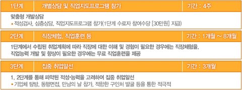 노동부 산하 전국고용지원센터에서 취업에 어려움을 겪는 청년층(만15~29세)에게 개인별 종합지원서비스를 제공하여 취업을 돕는 프로그램 입니다.