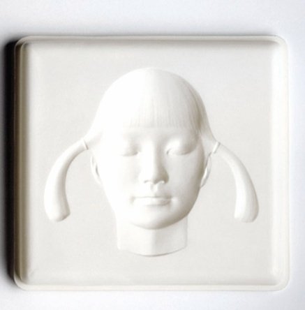 백색의 입체적인 표현으로 얼굴 정면 하나만 부조로 표현한 앨범커버 있으면