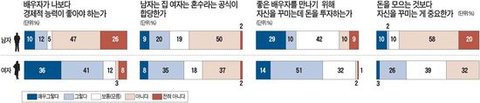 반면 여성들은 전체의 77%가 '그렇다'고 답해 대조를 이뤘다. 여성 응답자 중 '배우자의 능력이 자신보다 좋을 필요가 없다'고 말한 응답자는 11%에 불과했다.
