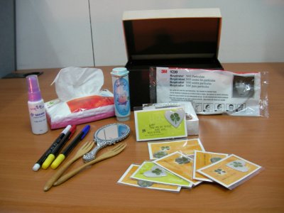 포크, 휴지, 거울, 펜을 챙기고, 그 다음! 튼튼함을 위해, 손세정제와, 마스크를 챙겼죠.