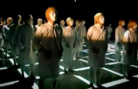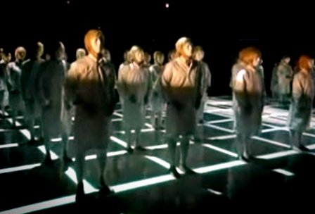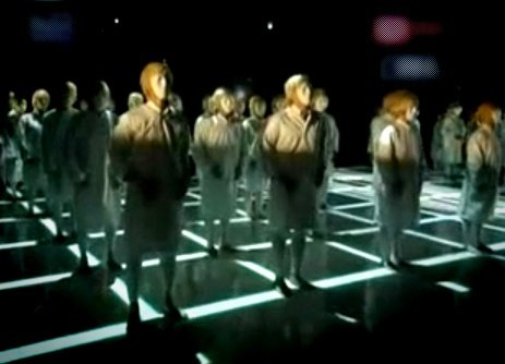 무표정으로 줄지어 뒤에 세워두고 공연하는 퍼포먼스..