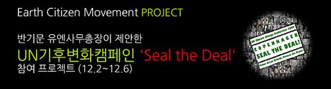UN기후변화캠페인 ‘Seal the Deal’은 반기문 UN사무총장이 제안한 글로벌 캠페인으로 일반 시민들의 서명을 받아 코펜하겐 회의에서 전 세계 정부에 촉구하는 것으로 활용될 예정입니다.