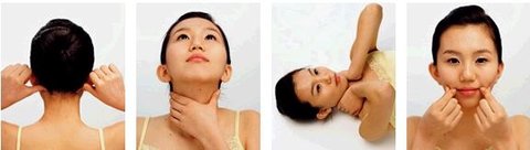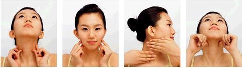 5 엄지를 이용해 목 아래쪽을 지그시 누른 뒤 근육이 팽팽하게 당겨질 정도로 천천히 문지르며 턱선까지 올라간다. 엄지가 턱선에 놓이게 되면 턱은 아래로, 엄지는 위로 20초간 힘을 준다. 3회 반복한다.