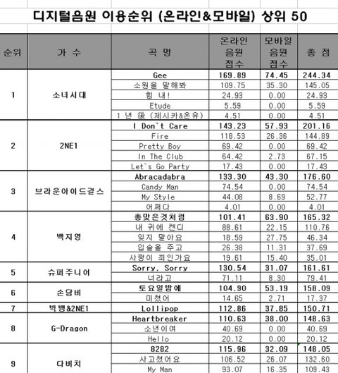음원성적으로 2NE1이 가장 높게 나오기는 하지만