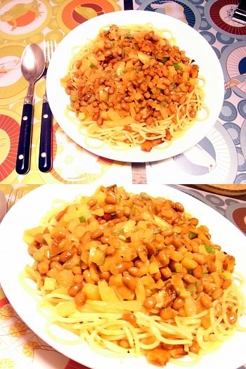 그냥 마늘 편썬것이랑 중국산 작은 빨간고추(죄송해요 설명이;;)씨 털어내시고 올리브유에 마늘색이 슬쩍 변할때까지 볶아주시다가 다진파,단무지,낫토를 섞어서 면이랑