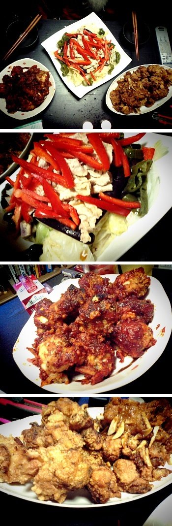 마늘간장소스로 둘러준 치킨과 그냥 치킨..세가지맛.