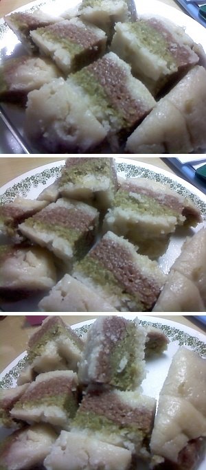 원래는 케잌을 만들려고 했었는데 겉모양 잡아 주는 틀이 없어서 저는 그냥 무지개 떡으로 하였어요 ^^