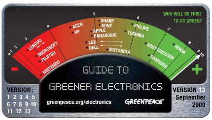 간담회를 다녀와서 그린 IT에 대해 검색을 하다 그린피스에서 발표한 Guide to Greener Electronics라는 순위를 봤습니다. 그린피스에서 가전제품을 만드는 업체를 대상으로 얼마나 친환경적인 노력을 하느냐에 따라 점수를 주고 있는데, 간담회를 가졌던 삼성전자의 경우 7.5점을 얻은 노키아에 이어 6.9점으로 2위에 올라 있더군요. 10점이 만점이니 1위/2위인 노키아와 삼성전자의 점수가 그리 높은 편은 아니죠. 기업들이 친환경 제품을 만드는데 있어.. 아직 갈 길이 멀다는 반응이겠죠.