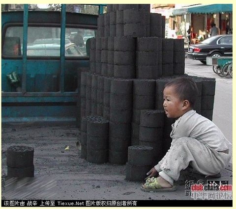 중국임. 연탄 일 하기엔 너무 어린데, 엄마 아빠 돕는 모양인 듯.