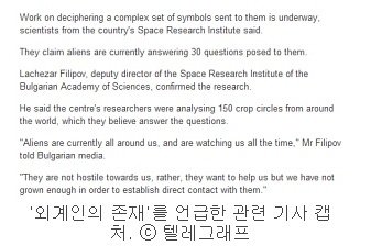 영국 텔레그래프 등 외신은 "불가리아 과학연구소 산하 우주연구소에서 '다른 별에서 온 생명체가 지구에 존재하며 그들과 접촉한 사실이 있다'고 밝혔다"고 26일 보도했다.