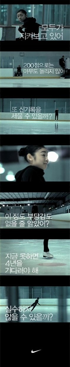 먼저 공개된 나이키 티저 광고에서는 아이스 링크에 홀로 있는 김연아 선수의 영상위로 문장들이 빠르게 지나갑니다.