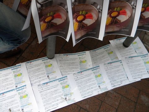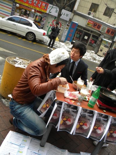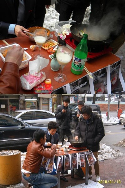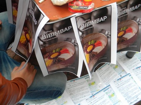 없어 그 기사를 바닥에 깔아놓고 우리의 비빔밥 광고전단지는 테이블에 붙혔습니다