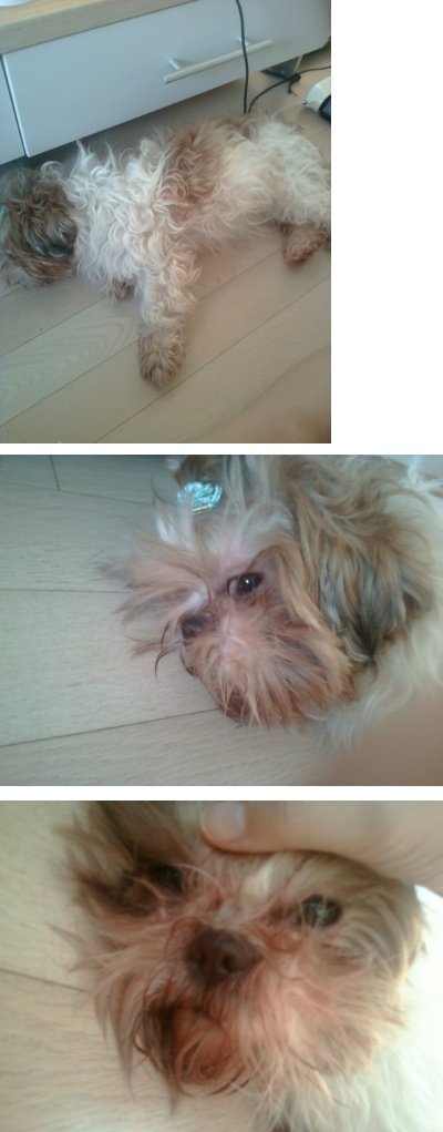 (털이 많이 엉켜있고 눈쪽에 눈꼽이 많이 굳어있어요)