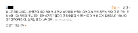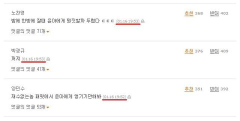 위 링크자료에서도 유사한 패턴으로 다른 뉴스 기사에서 같은 시간 연달아 쓰여진 악플이 나란히 추천수가 조작되었다는 걸 알 수 있습니다. << 베플에 대한 반박. 다시 한번 생각해보시길.