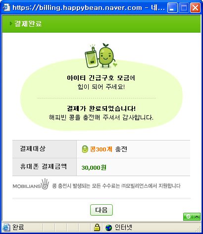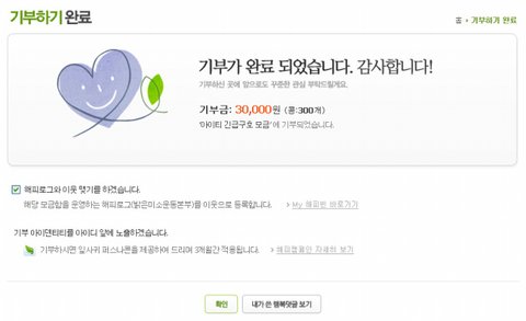 그리고, 혹 해피빈 콩이 없다면 1,000원 정도는 결제를 통해 기부