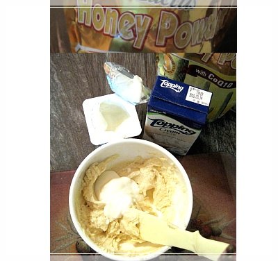 플레인 요거트, 생크림, 허니파우더, 녹인버터를 식빵에 발라주었어요~!