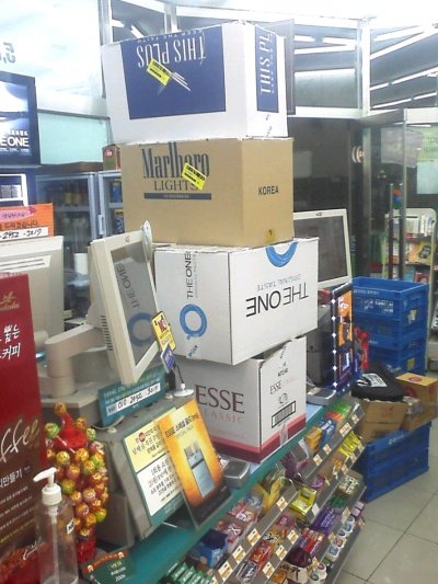 이상한 바퀴달린 차에 짐을 쌓아서 저희 가게안에 다 쌓은다음에