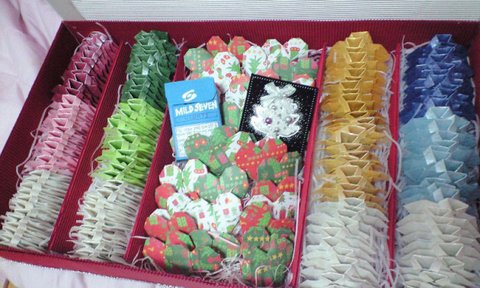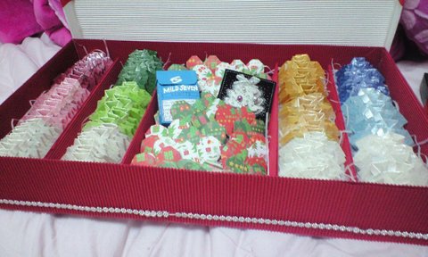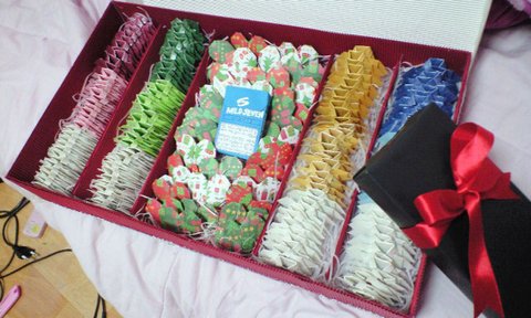 요건 선물의 핵심뽀인트!!!네 줄로 줄지어서 그라데이션 느낌으루 색깔별로 만든 셔츠쏠라씨 입니당넘 귀엽죠~~~하나하나 셔츠 모양으로 접고 안에 쏠라씨 맛별로 넣어주구 마무리로 리본모양 스티커를 붙였답니다!하나씩 접을때마다 인내심이 필요하지만기쁘게 먹구 좋아할 오빠모습을 상상하며 ...ㅠ_ㅠ셔츠 카라 만들때 꾹꾹 누르는게 좀 힘드러용..